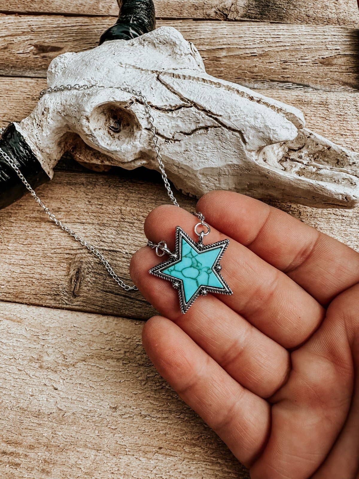 TURQUOISE STAR NECKLACE 18" Long Silver Western Pendant Necklace | Southwestern Jewelry | Punchy Cowgirl | Western Rodeo Necklace Add a touch of Western flair to your outfit with the Turquoise Star Necklace.