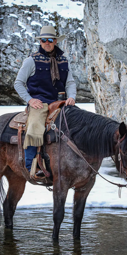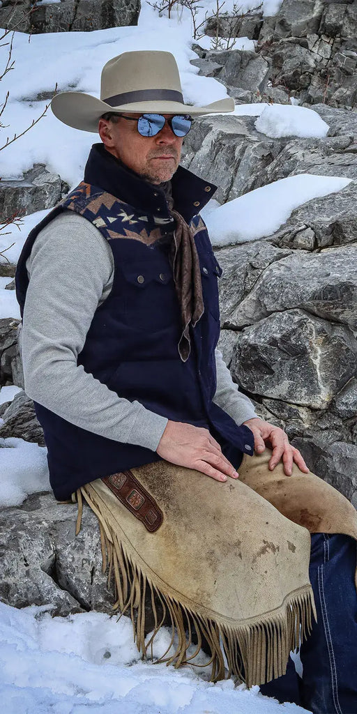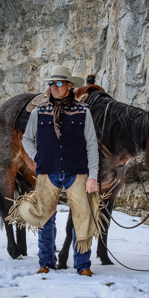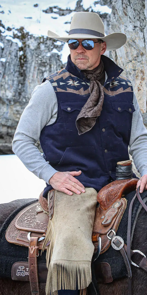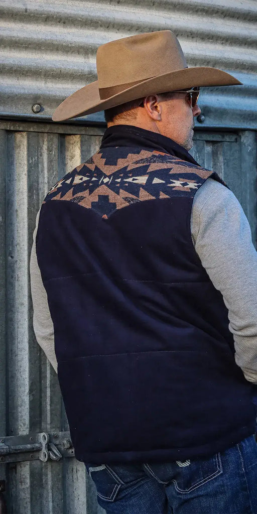 Men's two-tone vest with corduroy fabric with an Aztec design yoke. This vest features bold Aztec- inspired patterns that blend earthy tones with timeless style. Designed with front snap- button placket for easy wear with four pockets, two chest flap pockets plus two side hand pockets for added utility and A conceal and carry pocket to hide your treasure. The sleeveless design makes it perfect for layering over shirts, flannels or sweaters, giving you a versatile look that transitions effortlessly from casual outings or outdoor adventures.