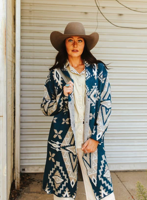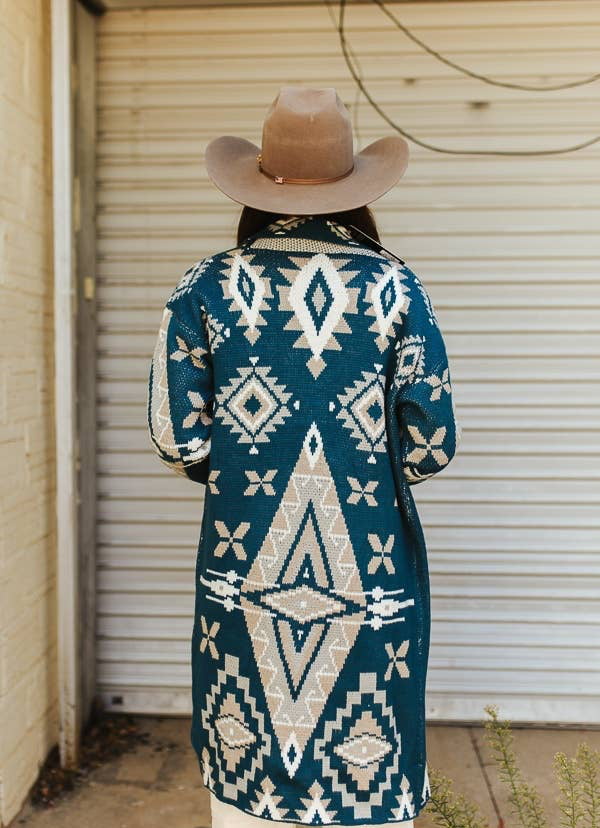 Add bold Western flair to your boutique with this Teal & Cream Aztec Knit Longline Cardigan from Lucky & Blessed. This cozy yet striking piece features a classic longline silhouette and is crafted in a soft, sweater-knit fabric perfect for layering in transitional and cool-weather seasons. The statement-making all-over Aztec pattern in neutral cream and tan tones pops beautifully against the rich teal background. Detailed with an open front, long sleeves, and a comfortable relaxed fit!
