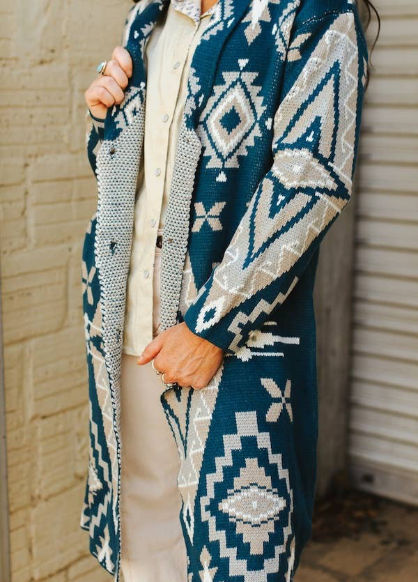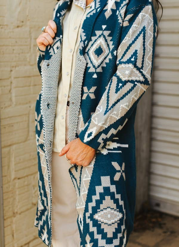 The Stockyards Teal Ivory Aztec Knitted Button Down Cardigan