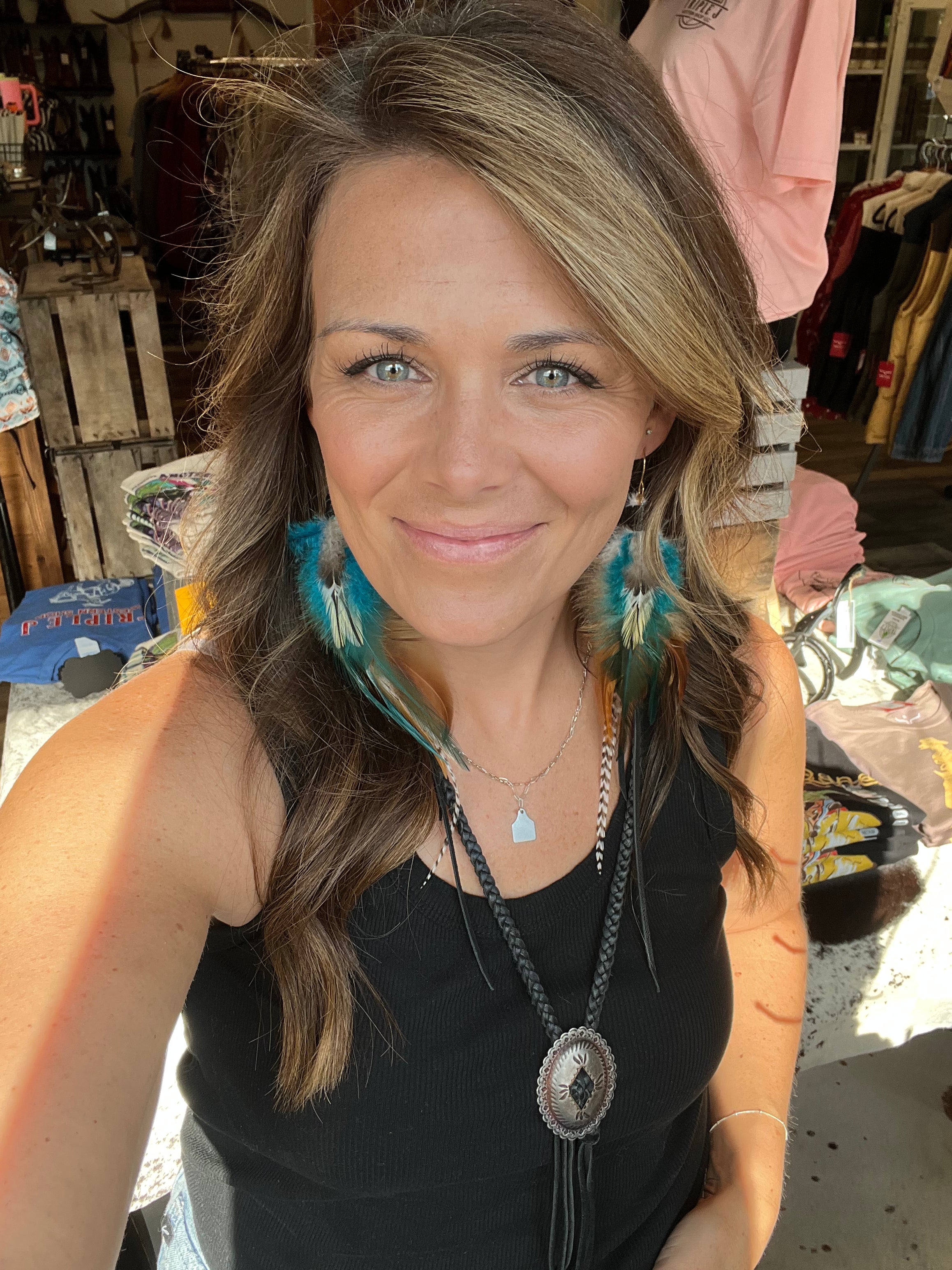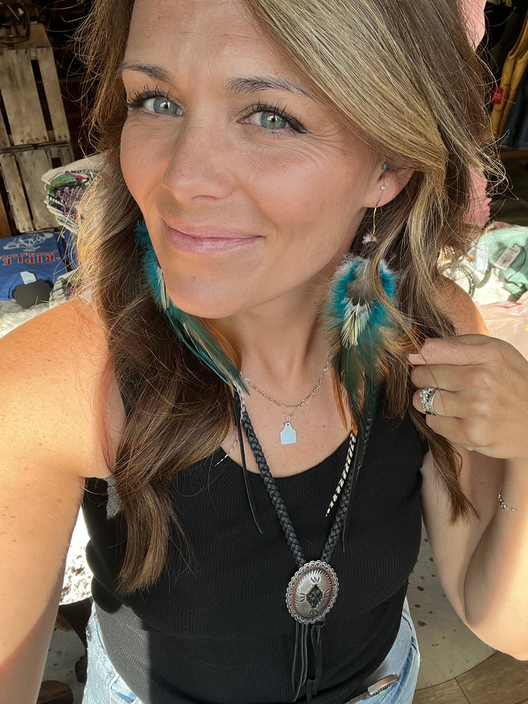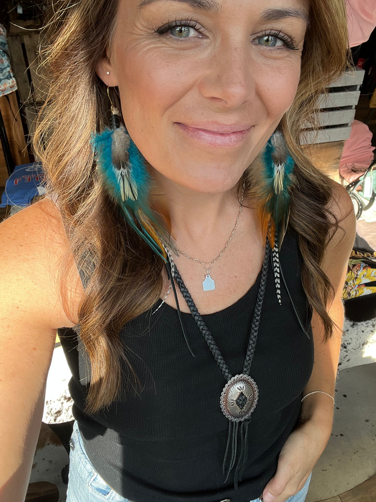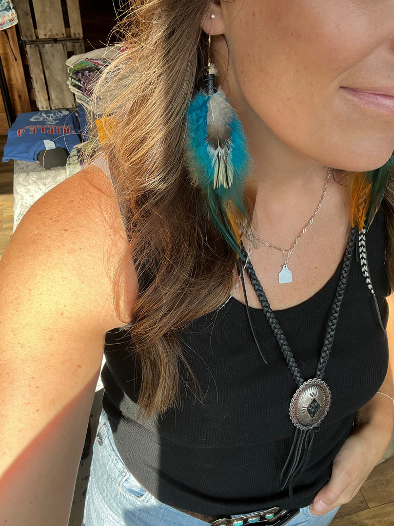 Beautiful statement feather earrings, with a pop of turquoise and added black leather tassels Size: aprox 6”- 7.5" L  Materials: Genuine leather, feathers, lead and nickel free  * keep in mind, Feather colors and lengths will vary as no two feathers are the same