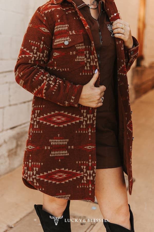 Step into fall fashion with our Rust Aztec Button Down Jacket Dress - a must-have statement piece for the bold Western woman. Designed with a rich rust base and all-over geometric Aztec patterns in earthy taupe and red tones, this dress brings a vibrant, vintage-inspired aesthetic. Crafted from soft fleece fabric, it delivers warmth and comfort without compromising on style. Featuring a structured shirt collar, long sleeves, and functional snap buttons down the front, it doubles as a shacket or dress for ultimate versatility. Chest flap pockets add a practical touch, while the flattering curved hemline and tailored fit ensure a polished silhouette. Pair it with cowboy boots for a full rodeo-ready look.