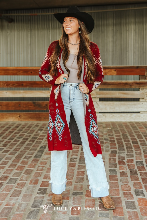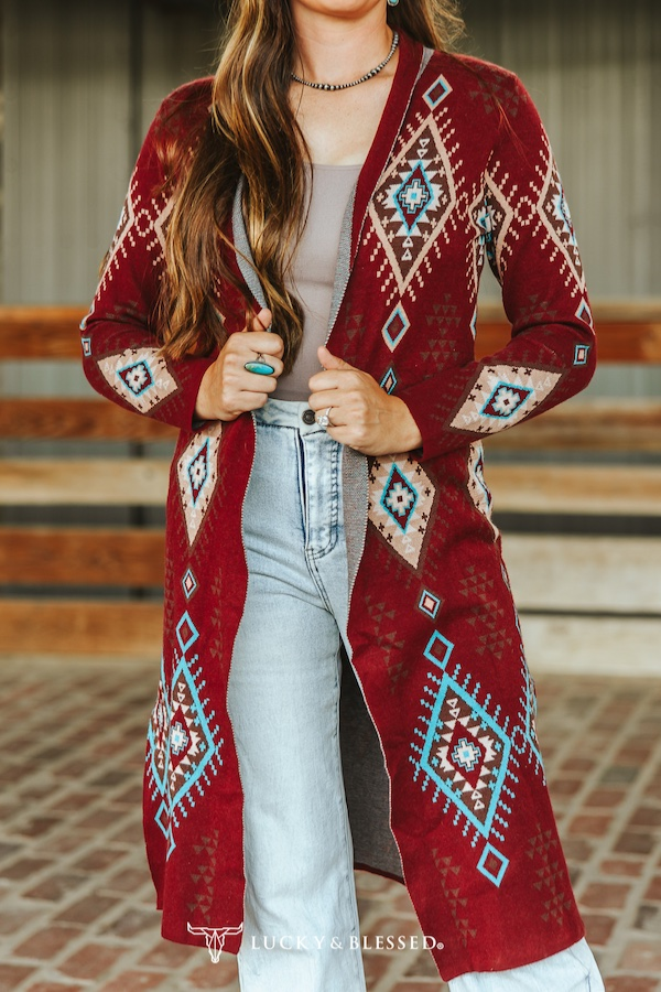 Wrap yourself in bold, rustic charm with this wine-colored Southwestern patterned duster cardigan by Lucky & Blessed. Designed with eye-catching tribal-inspired diamond motifs in turquoise, cream, and soft blue, this open-front knit layer radiates Western heritage with a modern twist. The mid-calf length and side slits offer easy movement, while the soft, textured knit ensures cozy comfort for every season. Ideal for pairing with denim and boots, this cardigan adds instant flair to any Western boutique collection. Western tribal print in rich wine with turquoise & cream accents Soft, thick knit for warmth and texture Open front with mid-calf length silhouette Side slits for movement and layering ease Perfect for layering over basics or graphic tees Wholesale-exclusive design for boutique resale NFR WESTERN RODEO WESTERN APPAREL