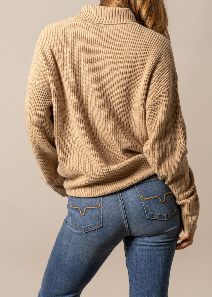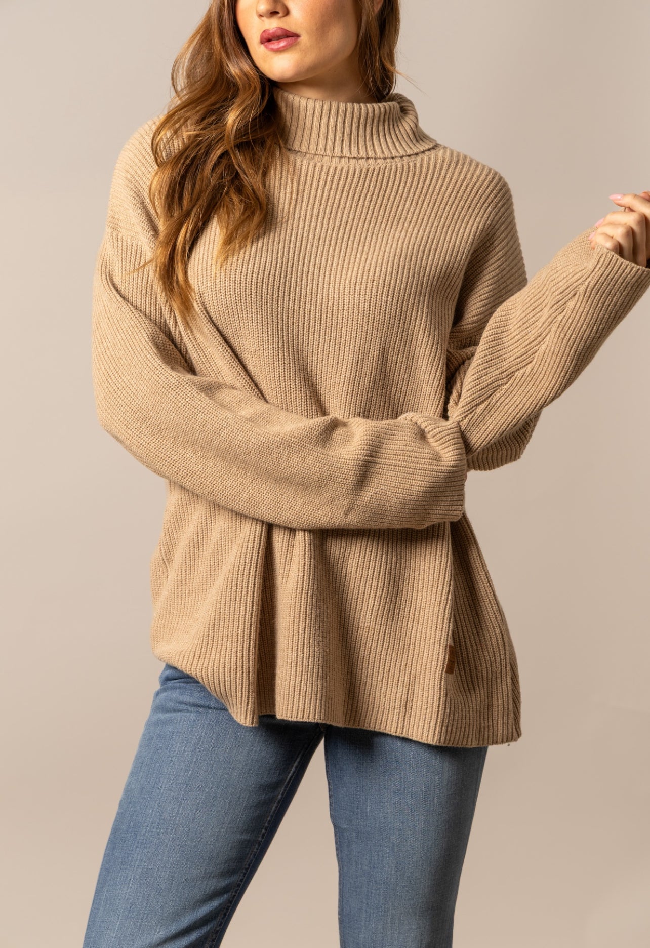 The Maisie turtleneck is your go to sweater for chili fall and winter days. Crafted from a soft wool blend this slouch, oversized turtleneck offers a cozy feel with elevated style. The longer body pairs perfectly with jeans or leggings, while the vertical knit adds subtle sophistication. Designed for all day, comfort and warmth, Maisie is the perfect blend of casual ease and refined western inspired charm.