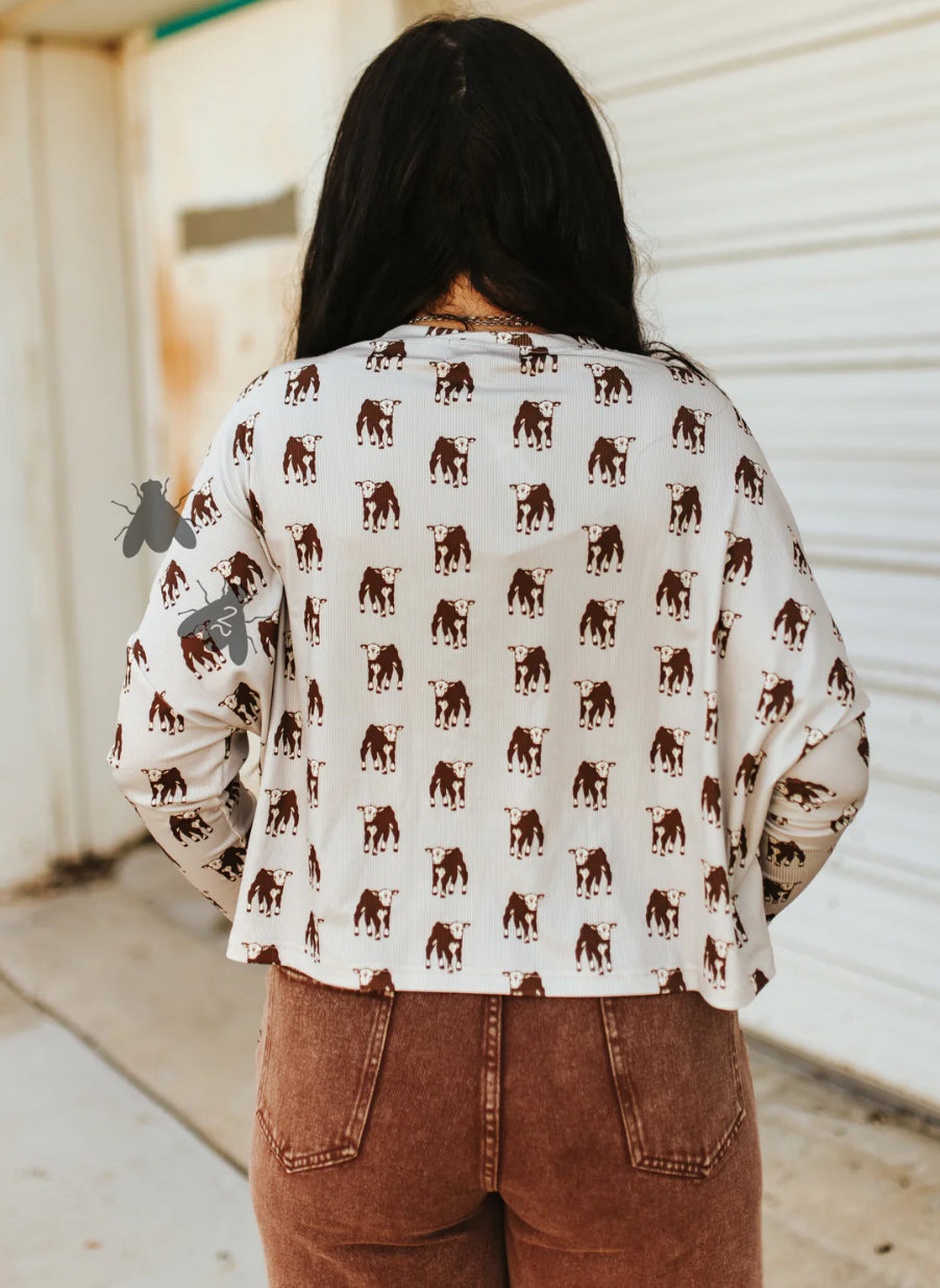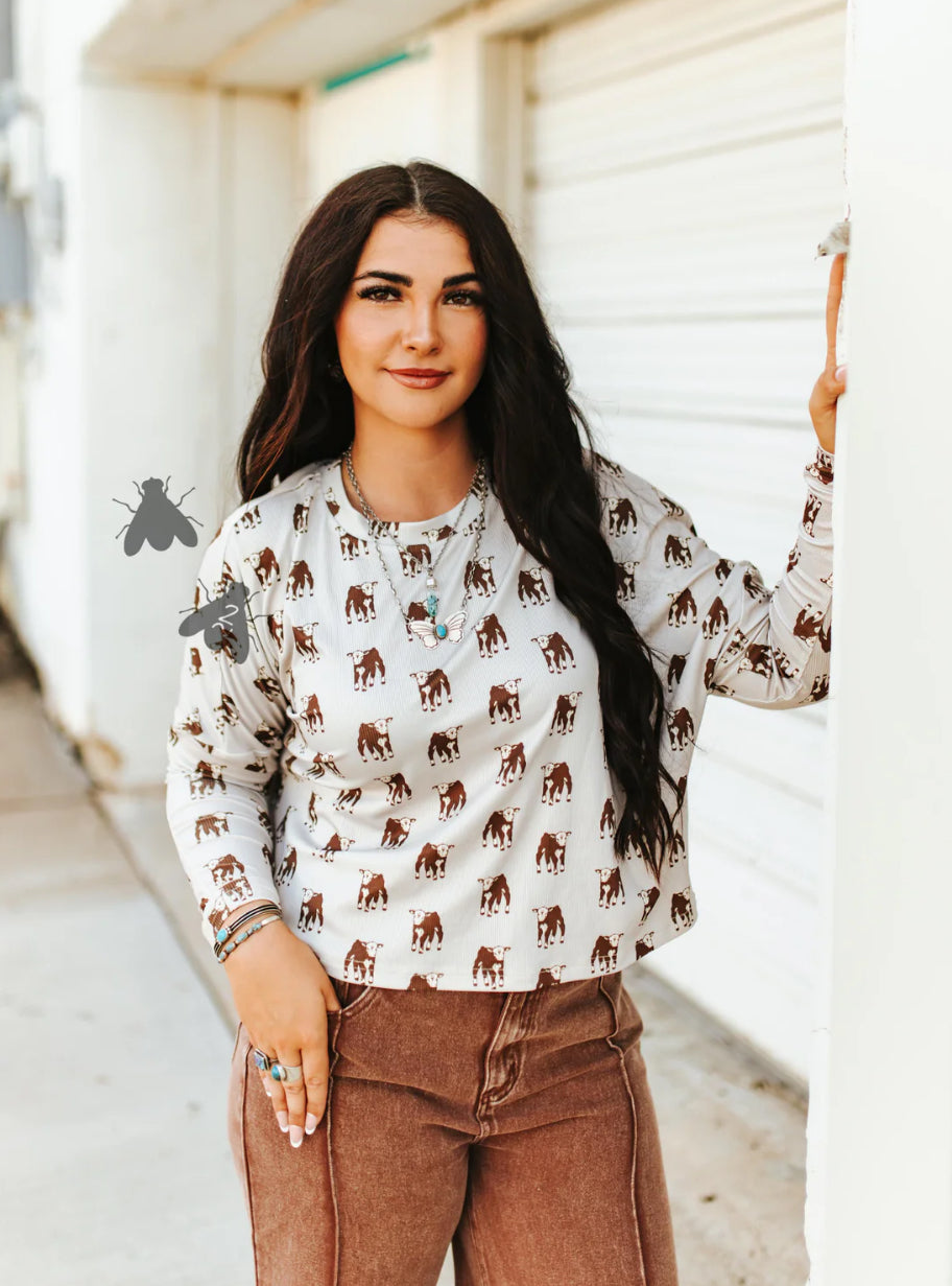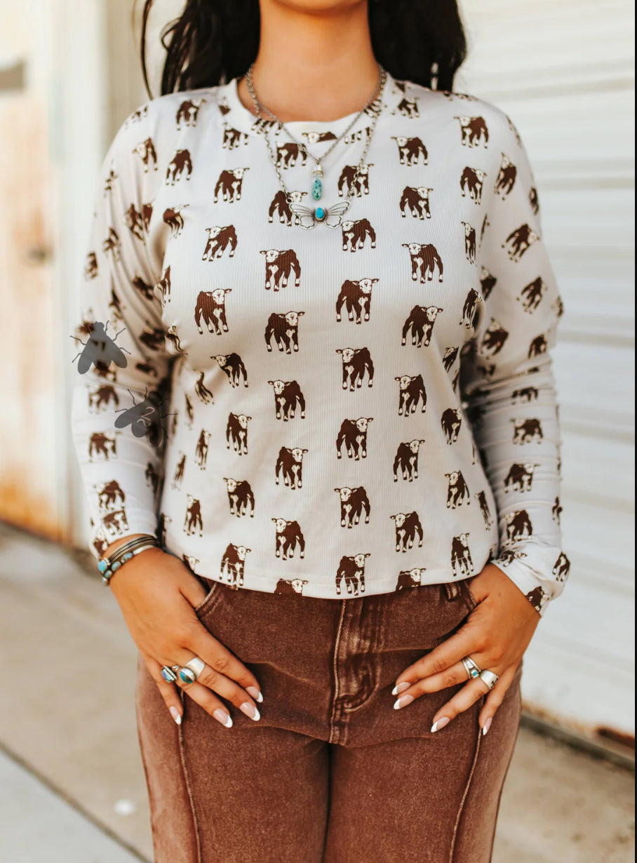 Don’t count this one out because you see the word crop, she’s a super modest cut, not so much crop just T-shirt length, but a tad shorter! It’s a slightly ribbed fabric, super comfy, and the little calves super cute! 🥰