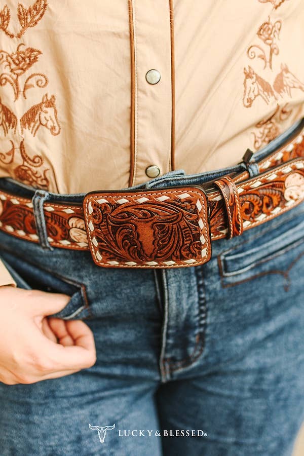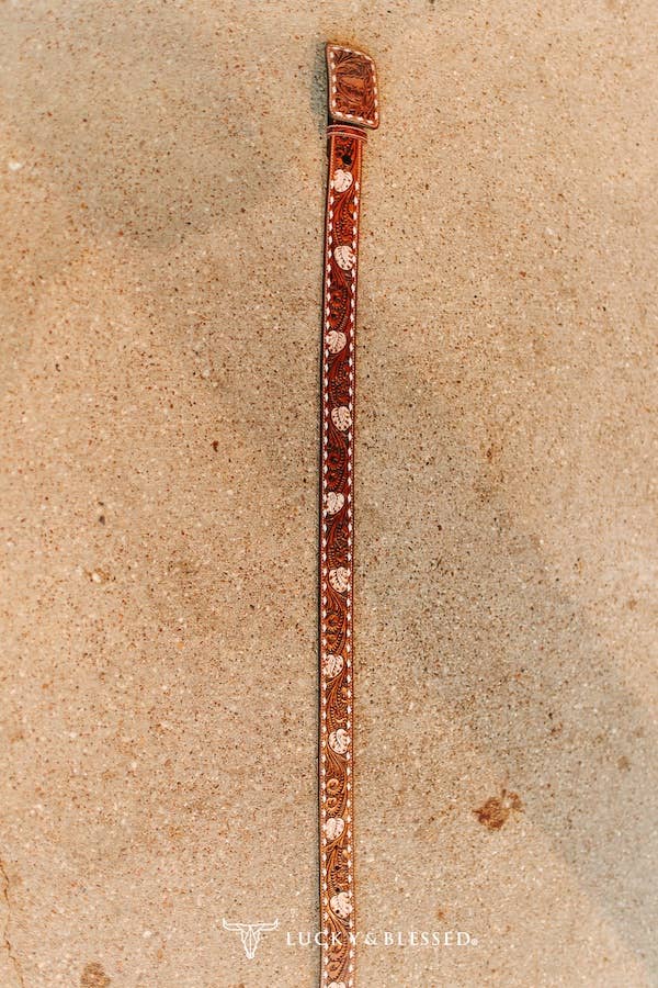 Elevate your western outfit lineup with this exquisitely tooled leather belt, designed for the modern cowgirl with a love for traditional craftsmanship. Crafted from premium chestnut leather, this slim western belt features intricate hand-tooled floral embossing in a high-contrast white overlay. The scrolling vine design brings classic western artistry to life, creating a refined vintage appeal. Finished with a coordinating tooled leather buckle, this belt is ideal for pairing with jeans, skirts, or layered over western dresses.
