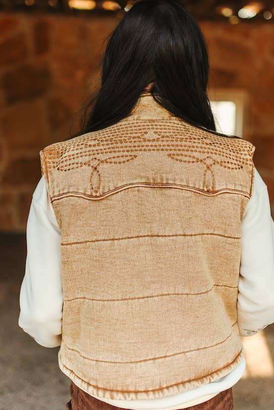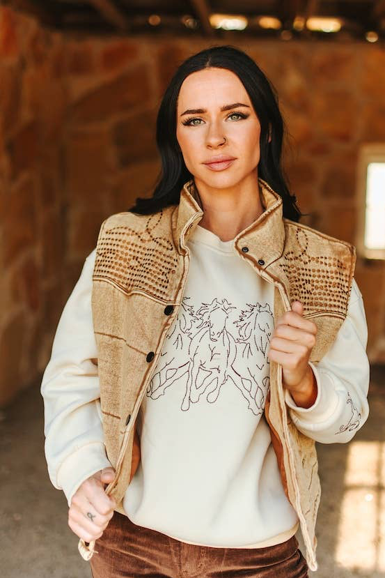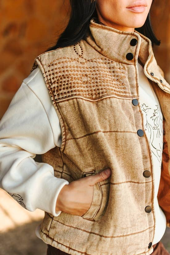 Designed for the modern cowgirl, this sleeveless vest features a soft washed fabric with a warm camel hue and rustic gradient patterning throughout the body. The standout detail lies in the yoke — intricately printed with tonal Western motifs including longhorn skulls, barbed wire, and geometric accents that exude rodeo flair and desert-chic charm. This vest is constructed with snap-front closures for easy layering and a structured silhouette that pairs perfectly with graphic sweatshirts, denim flares, or corduroy bottoms. The slightly faded finish adds that broken-in feel your customers crave, making it a versatile fall-to-winter staple. Whether styled open or buttoned up, it brings cozy Western sophistication to any outfit.