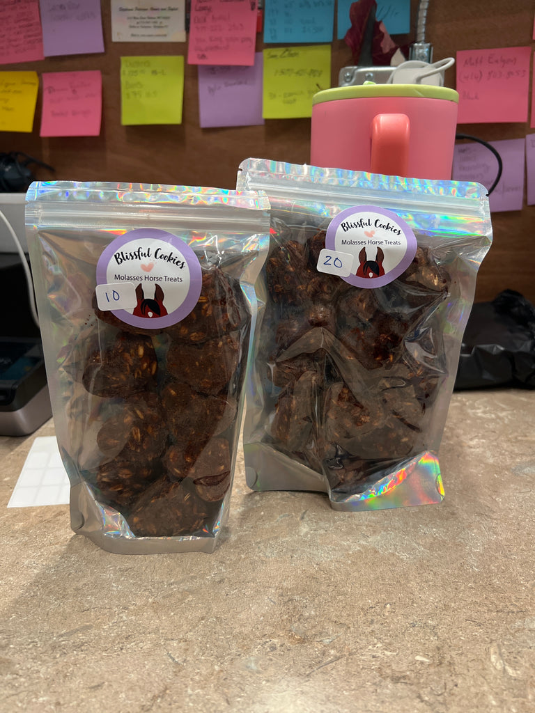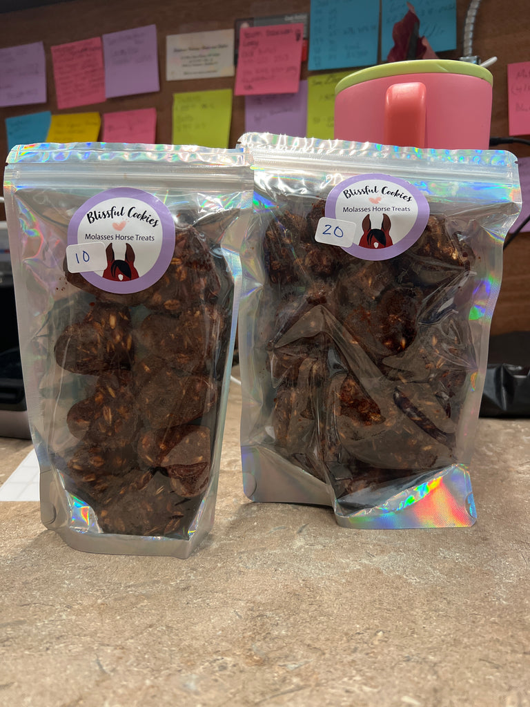 Handmade horse cookies. These delightful horse cookies, Equine tested & approved! Molasses horse treats are always a favourite! Clear stand up pouch display looks great on the counter can also be hung. For freshness each order is made to order. Each cookie is approx 1.5" wide and 1" deep.