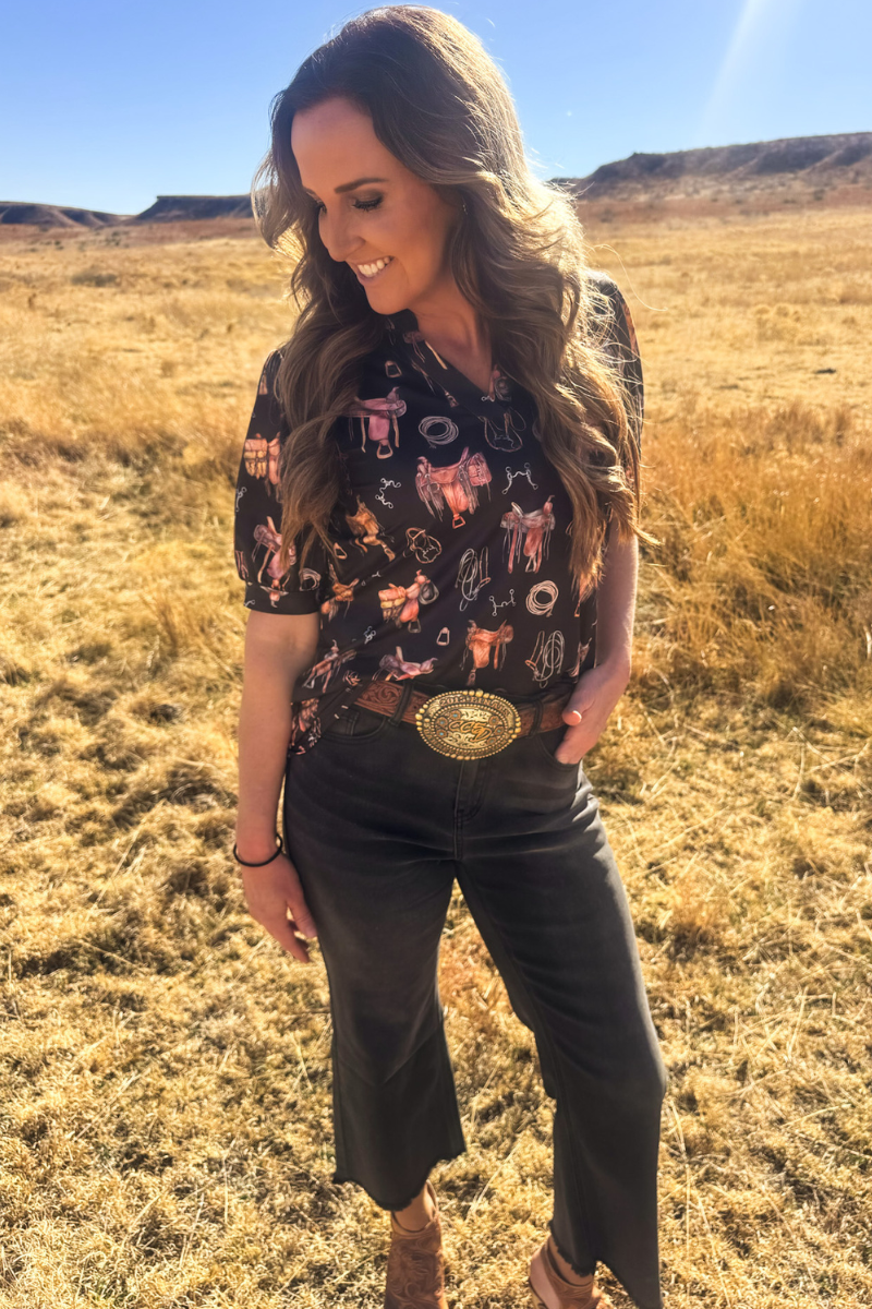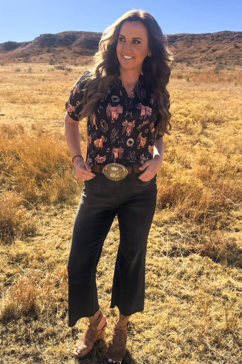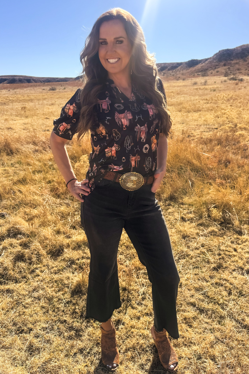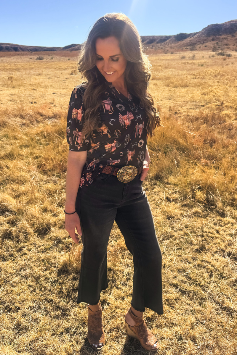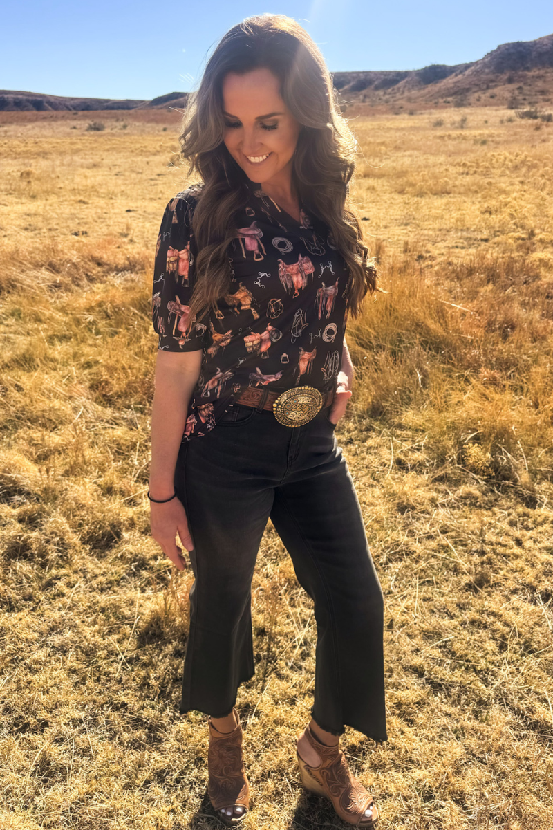 Elevate your style with this striking black short sleeve top featuring bubble sleeves and intricate saddle room details. Adorned with saddles, bits, ropes, and stirrups throughout, this piece celebrates your passion for horses with sophisticated flair. The playful bubble sleeves add contemporary charm while the classic black backdrop keeps the design versatile and wearable. Perfect for ranch days, casual outings, or showing off your love for all things equestrian.