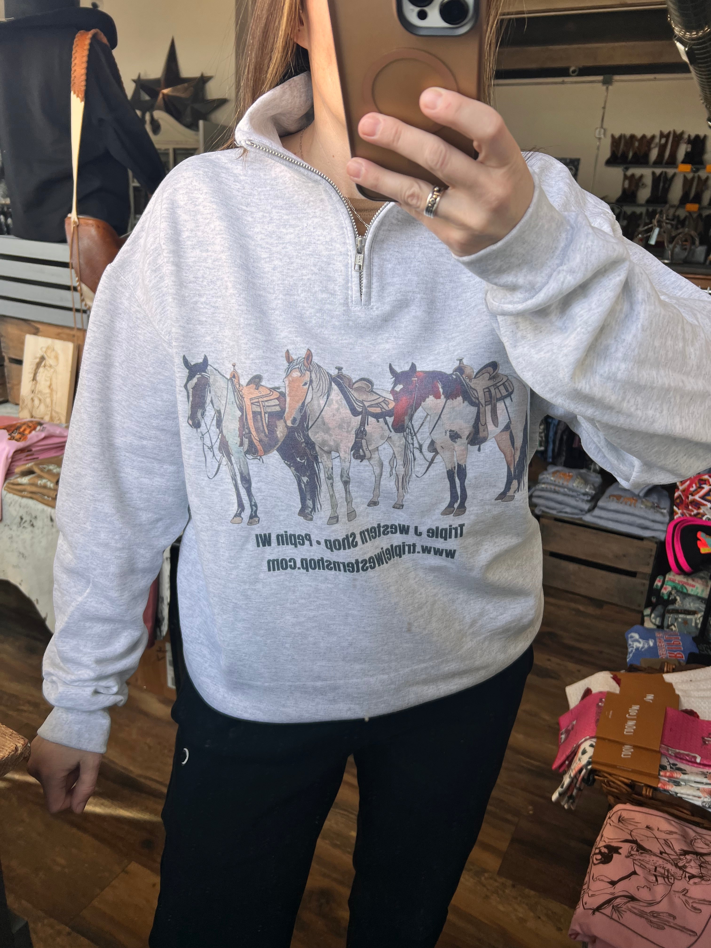 Support your fav little western store! This is printed by the sweetest gal in LA. You are supporting two women owned businesses when you purchase this 1/4 zip.